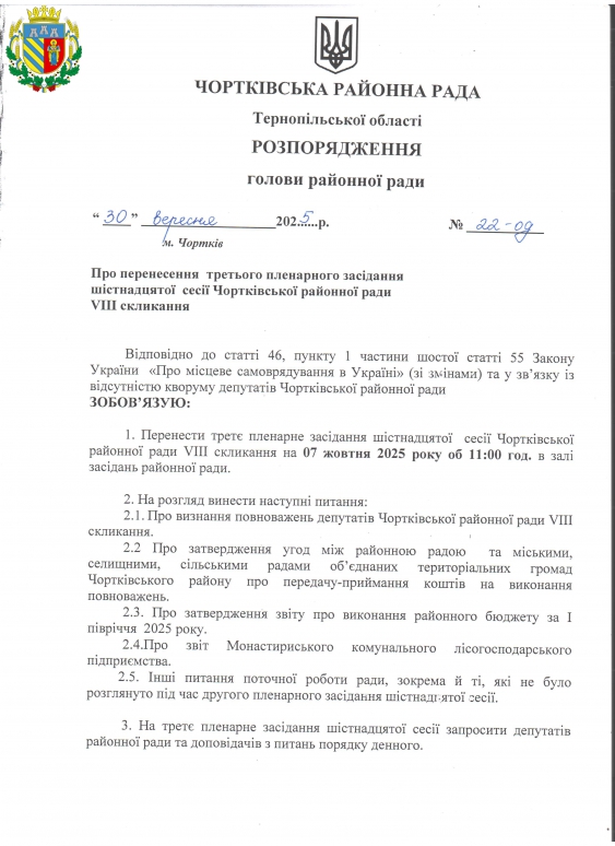 Про перенесення третього пленарного засідання шістнадцятої сесії Чортківської районної ради VIII скликання