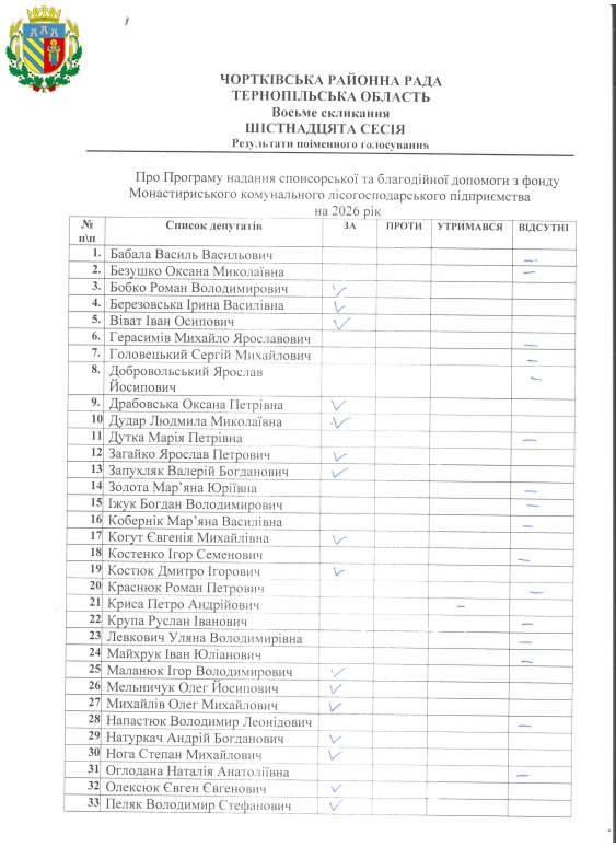 Документи Рішення Рішення VІІІ скликання XVI IV пленарне засідання (30 грудня 2025 року) 304-321 314 Про Програму надання спонсорської та благодійної допомоги з фонду Монастириського комунального лісогосподарського підприємствана на 2026 рік
