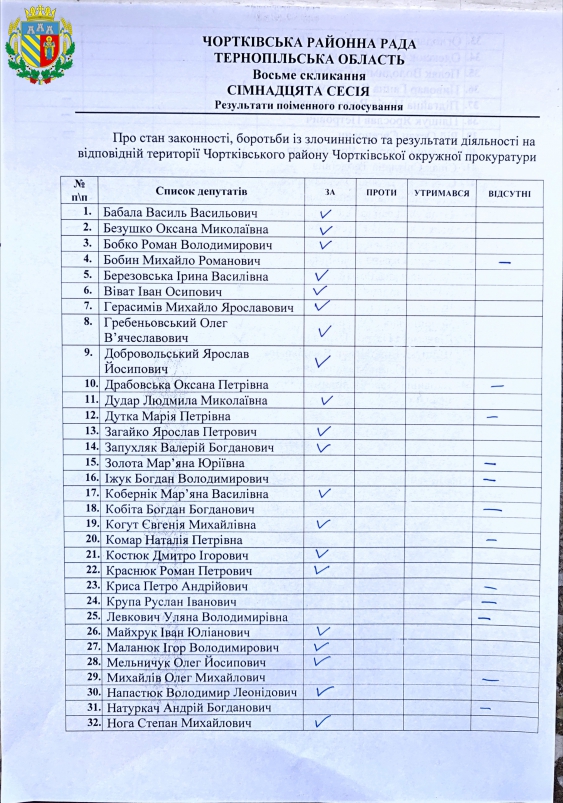 Відповідно до пункту 36 частини першої статті 43 Закону України «Про місцеве самоврядування в Україні», статті 6 Закону України «Про прокуратуру», заслухавши інформацію Чортківської окружної прокуратури, враховуючи висновки та рекомендації постійної комісії районної ради з правових питань, депутатської діяльності, етики та регламенту від 26 березня 2026 року, Чортківська районна рада