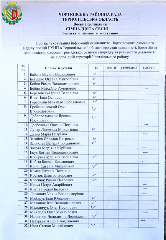 Відповідно до пункту 36 частини першої статті 43 Закону України «Про місцеве самоврядування в Україні», заслухавши інформацію керівництва Чортківського районного управління поліції ГУНП в Тернопільській області про стан законності, боротьби із злочинністю, охорони громадської безпеки і порядку та результати діяльності на відповідній території Чортківського району, враховуючи висновки та рекомендації постійної комісії районної ради з правових питань, депутатської діяльності, етики та регламенту від 26 березня 2026 року, Чортківська районна рада
