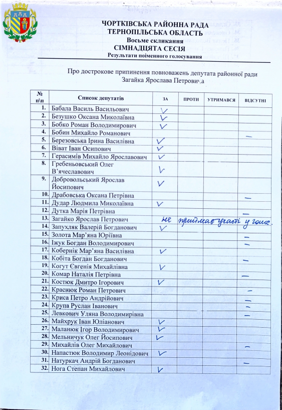 1. Припинити достроково повноваження депутата Чортківської районної ради восьмого скликання ЗАГАЙКА Ярослава Петровича, обраного від політичної партії «Сила людей» на підставі особистої заяви про складення депутатських повноважень.