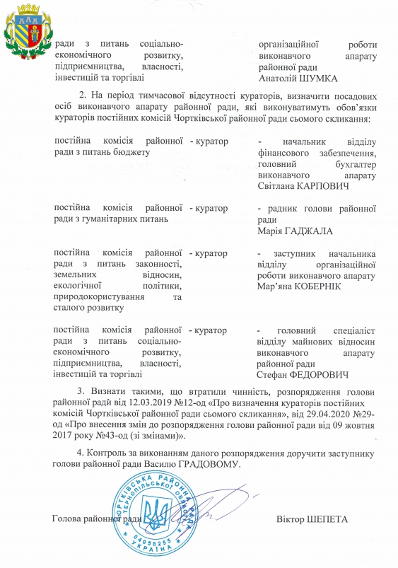 Документи Розпорядження голови районної ради з основної діяльності 2020 №56-од "Про визначення кураторів постійних комісій Чортківської районної ради сьомого скликання"