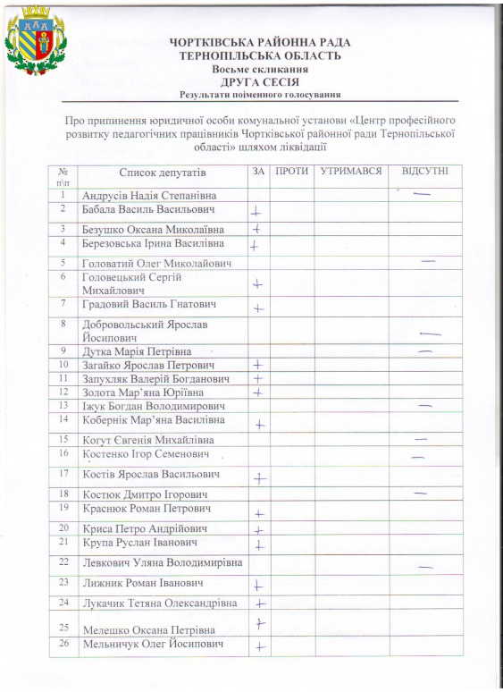 1. Припинити юридичну особу - комунальну установу «Чортківський районний центр професійного розвитку педагогічних працівників» Чортківської районної ради Тернопільської області (КУ «ЧРЦПРПП») (код ЄДРПОУ 36467596) шляхом ліквідації.