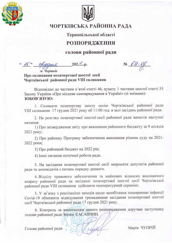 Документи Розпорядження голови районної ради з основної діяльності 2021 №64-од "Про скликання позачергової сесії Чортківської районної ради VІІІ скликання"