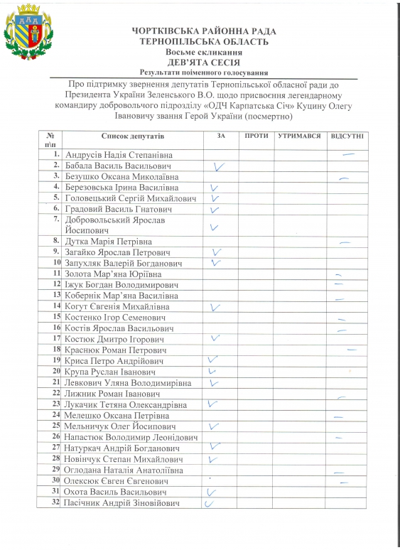 1. Підтримати звернення депутатів Тернопільської обласної ради до Президента України Зеленського В.О. щодо присвоєння легендарному командиру добровольчого підрозділу «ОДЧ Карпатська Січ» Куцину Олегу Івановичу звання Герой України, посмертно (додається).