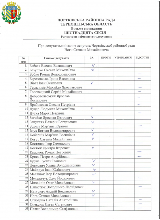 1. Підтримати депутатський запит депутата Чортківської районної ради НОГИ Степана Михайловича та направити до Департаменту розвитку інфраструктури Тернопільської обласної державної адміністрації, Чортківської міської ради, для розгляду.